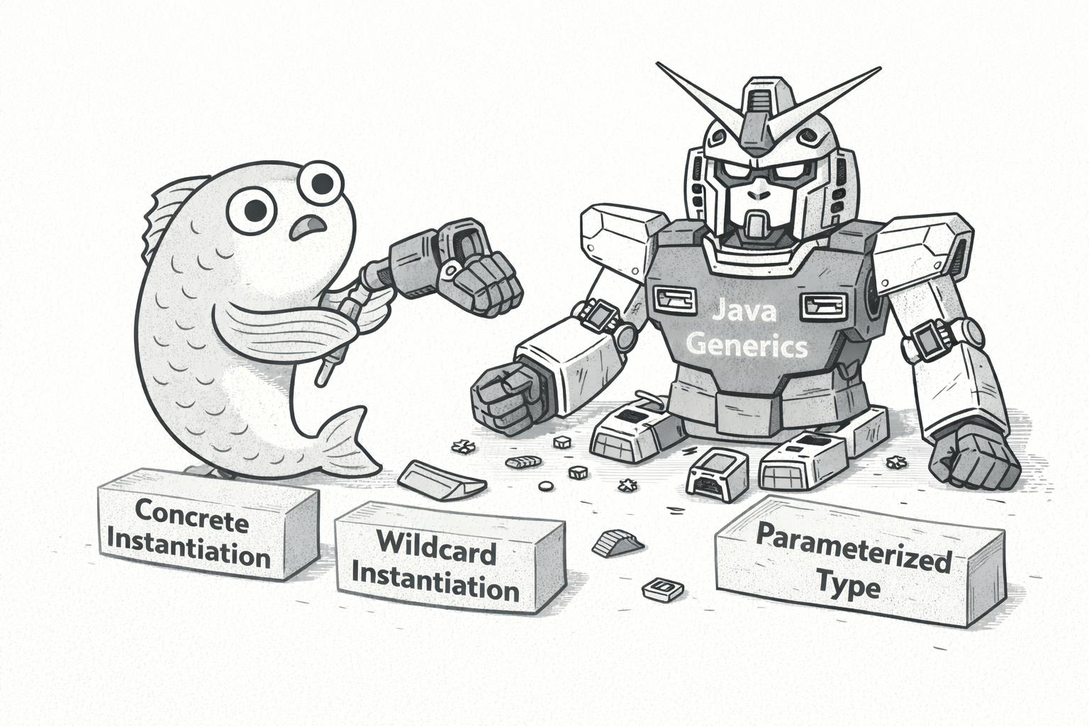 参数化类型可细分为两类,分别是具体参数化类型(concrete parameterized type)和通配符参数化类型(wildcard parameterized type),对应的实例化过程也称为具体实例化(concrete Instantiation)和通配符实例化(wildcard Instantiation)。